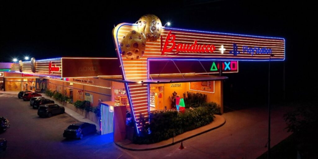 A ativação de brand experience, que fica ainda mais chamativa à noite com seus neons acesos, faz parte da parceria da marca com a PlayStation, referência global em entretenimento digital.