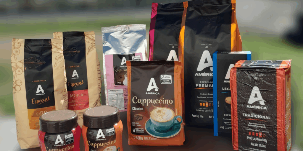 Café América Tradicional – Traz um blend de grãos das melhores regiões cafeeiras do Brasil submetidos a uma torra média que proporciona uma bebida encorpada, aromática e com sabor prolongado. Disponível em embalagens de 500g à vácuo e almofada.