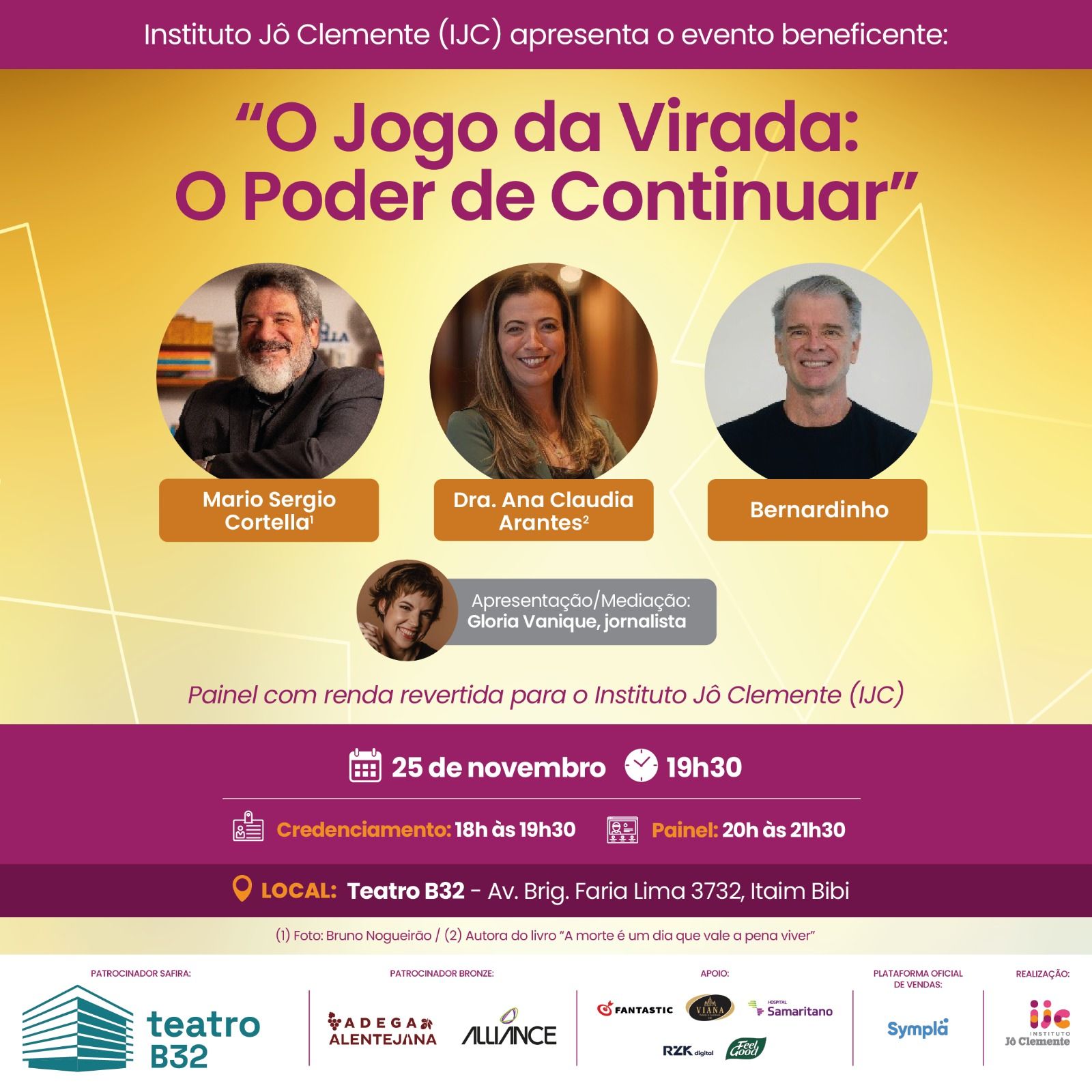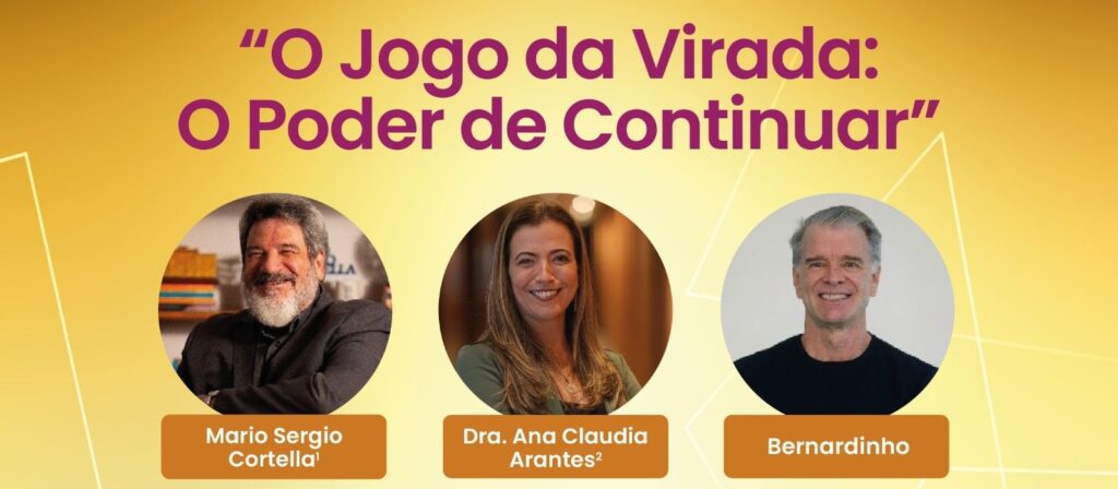 A palestra ‘O jogo da virada: o poder de continuar’, com Mario Sergio Cortella, Ana Claudia Arantes e Bernardinho, será apresentada no dia 25 de novembro, no Teatro B32, em São Paulo.