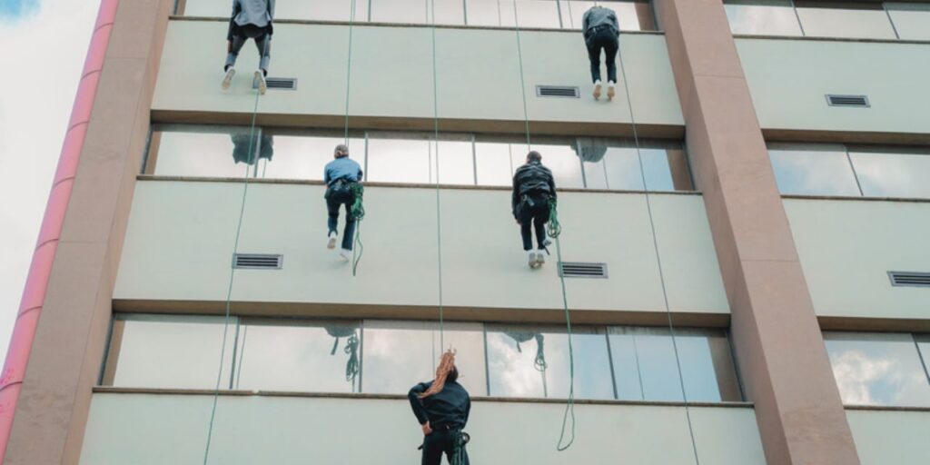 O verdadeiro clímax da ação aconteceu quando os participantes foram surpreendidos com uma performance aérea eletrizante, realizada pelo Grupo Ares, na própria fachada da ESPM. Os artistas, suspensos a dezenas de metros do chão, transformaram o prédio em uma passarela vertical, apresentando os looks da coleção Urban + Missão: Impossível com movimentos coreografados que mesclavam adrenalina, arte e estilo.